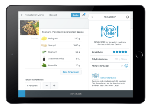 Berechnen Sie schnell und einfach die CO2-Emissionen Ihrer Speisen mit der KlimaTeller App auf dem Desktop oder Tablet: Sie geben die Zutaten und deren Menge an und erhalten in Echtzeit die Information, wie viel Emissionen das Gericht verursacht. Die Berechnung basiert auf einer wissenschaftlich fundierten Datenbank unseres Kooperationspartners Eaternity. Sie ist derzeit die umfassendste ihrer Art weltweit.